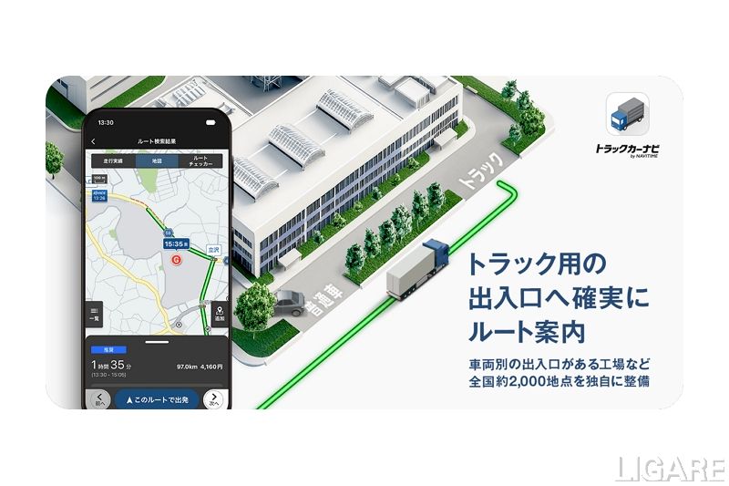 株式会社ナビタイムジャパンは12月10日、トラック専用カーナビアプリ「トラックカーナビ by NAVITIME」において、物流施設や工場など、大型施設のトラック向け出入口を考慮したルート案内が可能となると発表した。