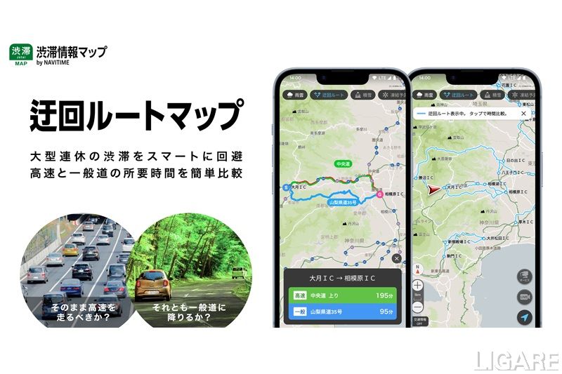 ナビタイム、高速と一般道の所要時間を比較できる「迂回ルートマップ」機能を提供開始 会員限定記事 2026/4/28(火) Post Share Pocket RSS 株式会社ナビタイムジャパンは、リアルタイムの道路交通情報に特化したアプリ「渋滞情報マップ by NAVITIME」において、高速道路経由と一般道経由の所要時間およびルートを比較できる新機能「迂回ルートマップ」の提供を2026年4月23日(木)より開始した。ゴールデンウィークなどの大型連休におけるドライバーの渋滞対策をサポートする。 ※このコンテンツは会員限定です。無料会員登録すると続きをお読みいただけます。 会員登録済みの方はログインしてください。 ログイン ログイン メールアドレス パスワード ログイン情報を記憶 新規ユーザー登録 パスワードをお忘れですか ? LIGARE編集部T.M MaaSNAVITIMEアプリナビタイムビッグデータモビリティ混雑情報経路検索観光 Post Share Pocket RSS 関連記事: ナビタイム、「渋滞ライブカメラ」機能を提供開始 道路状況を確認可能 ナビタイム、全国の高速道路の渋滞予測カレンダーをアプリ内で提供開始 ナビタイム、AIによる駅混雑予測を活用した推奨出発時刻等を提供開始 ナビタイム、iPhoneロック画面でのバスのリアルタイム案内提供開始 積水ハウス、次世代交通「Zippar」を開発するZip Infrastructureへ出資。移動格差の解消へ JTB、青海氏の社長昇格を発表。現社長の山北氏は会長 現会長の高橋氏は相談役に