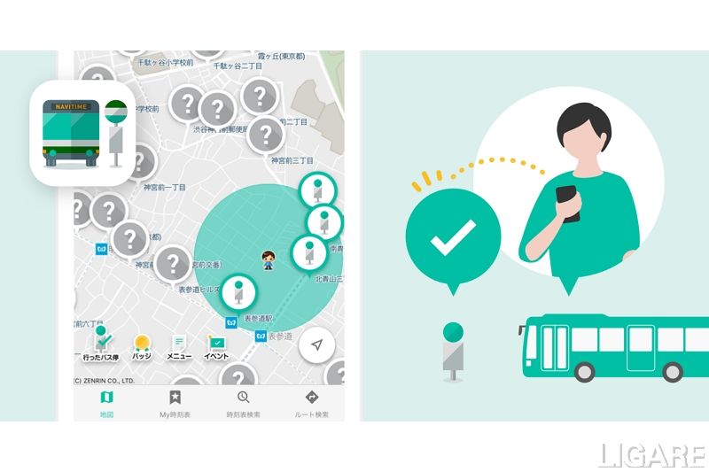 今回の機能は、GPSをオンにした状態で現在地周辺のバス停にチェックインすると、そのバス停を記録できる機能だ。ナビタイムジャパンのバスデータは、全ての路線バス・コミュニティバスを網羅しており、日本全国のバス停にチェックインできる。訪れたバス停やそのバス停にチェックインした回数を地図上で確認できたり、チェックインした回数に応じてバッジを獲得することが可能だ。