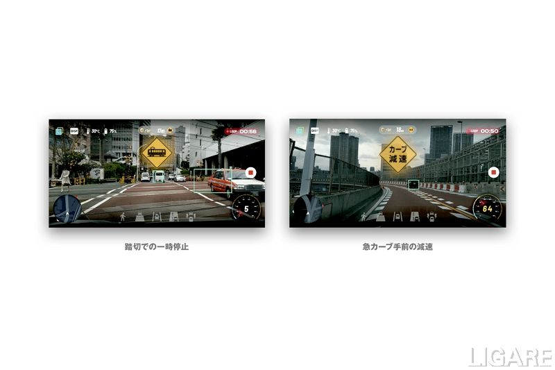 今回ナビタイムジャパンは、ARによる注意喚起に、踏切での一時停止案内と、急カーブ手前での注意喚起を追加する。ARによって踏切や急カーブ地点までの距離を表示し、一時停止やスピードの減速を促す。