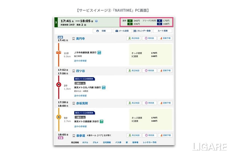 ナビタイムジャパン、ルート検索でフリーパス区間を考慮した運賃表示対応