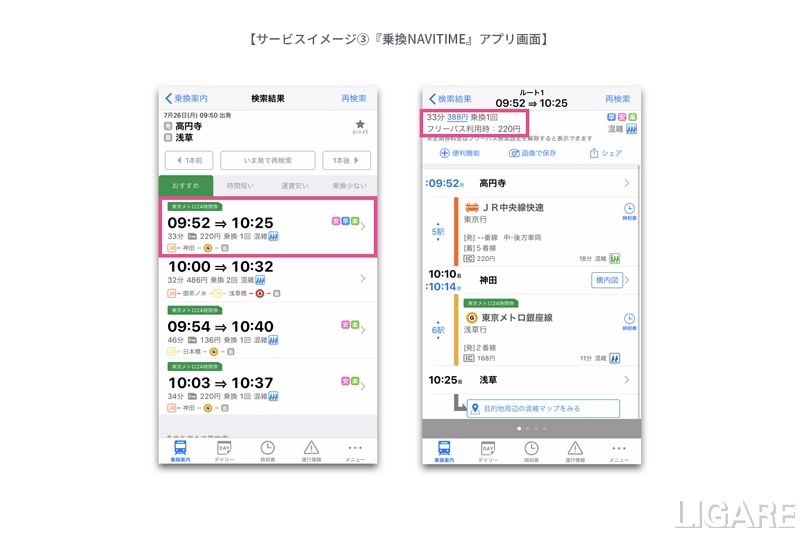 株式会社ナビタイムジャパン(以下、ナビタイムジャパン)は7月29日、フリーパスの区間を考慮した運賃表示に対応すると発表した。「NAVITIME」(アプリ、Web)および「乗換NAVITIME」(アプリ)で提供している「フリーパス検索」機能において対応する。