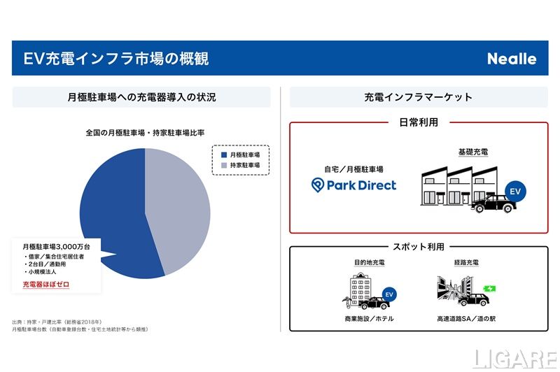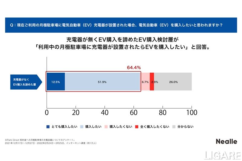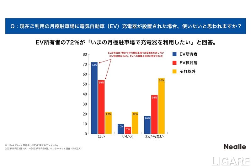 ニーリーは、モビリティSaaS「Park Direct(パークダイレクト)」を運営している。同サービスのユーザーに実施した調査によれば、充電設備が無く購入を諦めたEV購入検討層の64.4%が、「自身が使用する月極駐車場に充電器が設置されれば、EVを購入したい」と回答した。また、EV所有者の72%が、「利用中の月極駐車場で充電器を利用したい」と今の充電環境に満足していないと回答している。
