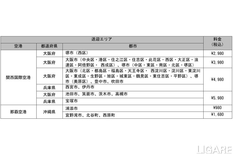 同社は、今後も高まっていくことが予想される観光需要に対応するため、関西国際空港からの送迎エリアに、京都府の9市町村、大阪府の8市、兵庫県の3市を追加した。さらに、那覇空港からの送迎エリアには、宜野湾市、北谷町、西原町の3つの地区を送迎エリアとして追加している。