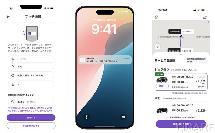 今回のプロジェクトの核となるのは、国交省の「リアルタイム相乗りタクシーマッチングシステム開発プロジェクト」として採択されたニアミーが独自開発したAI技術。これまで同社が主に事前予約型の「エアポートシャトル」で培ってきた相乗り(ライドプーリング)の仕組みを、リアルタイムでのマッチングが可能なシステムへと進化させた。