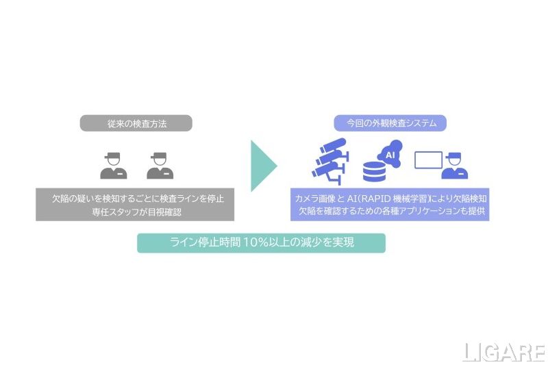 NECは、今回の取り組みにおいて、既存の検査ラインに影響を及ぼさない位置に産業用カメラを追加で設置し、複数のカメラ画像と「NEC Advanced Analytics – RAPID機械学習」を活用して中間製品の欠陥を解析する外観検査システムを構築した。これにより、欠陥検知の精度を高めるとともに、正常箇所を欠陥と誤認識してしまう過検出の発生頻度を大幅に抑制することで、中間製品検査ラインの停止時間を10%以上減少させている。