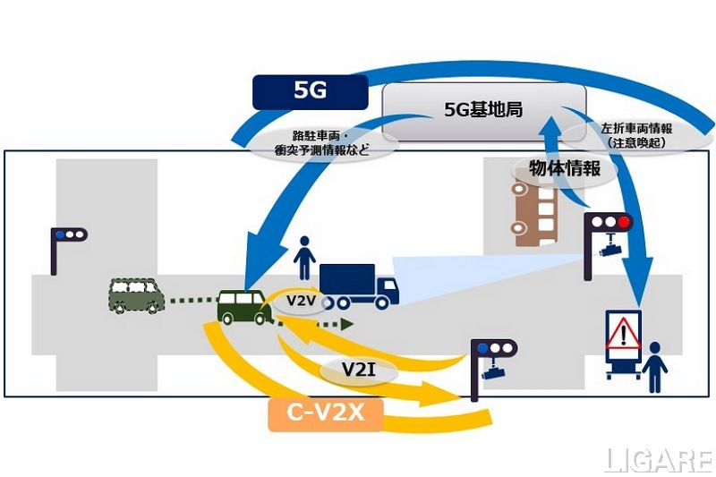 まず、ローカル5Gを用いて道路付帯物に設置したカメラで交差点映像を取得・分析して、周囲の5G未搭載車両に横断者情報や衝突予測情報、速度超過車両情報を通知する「ローカル5Gと映像分析の先進技術実験」。