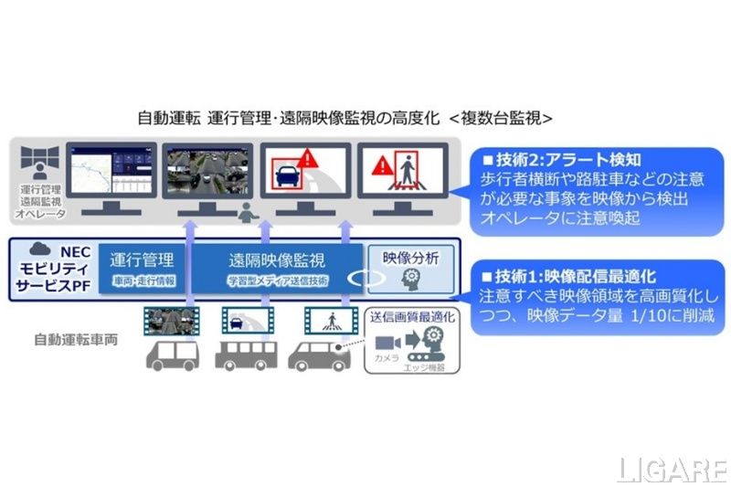 また、運行監視の高度化においては、2024年度はオペレータの目視のみで安全運行を監視していたが、今回は複数台の監視を見据え、NECの映像配信技術と映像分析に基づくアラートシステムの検証も一部期間で行うとのことだ。