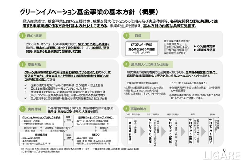 「グリーンイノベーション基金事業」は、2050年カーボンニュートラルの実現に向け、NEDOに2兆円の基金を造成し、野心的な目標にコミットする企業等に対して、10年間、研究開発・実証から社会実装までを継続して支援するというものだ。これまでには、「大規模水素サプライチェーンの構築」や「次世代型太陽電池の開発」などを採択している。
