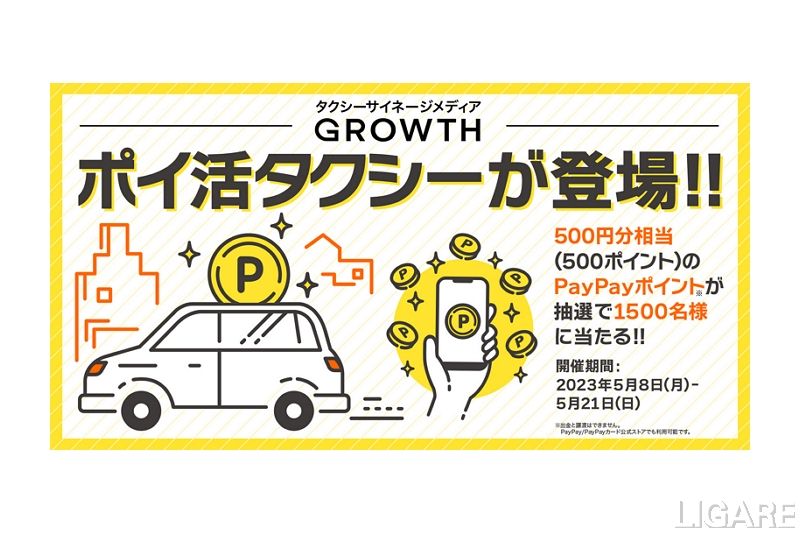 今回のキャンペーンは、PayPayポイントと連携して行う、タクシー利用者に向けた還元キャンペーンだ。同社が運営するタクシーサイネージメディア「GROWTH」を活用し、5月8日~5月21日の期間限定で実施する。