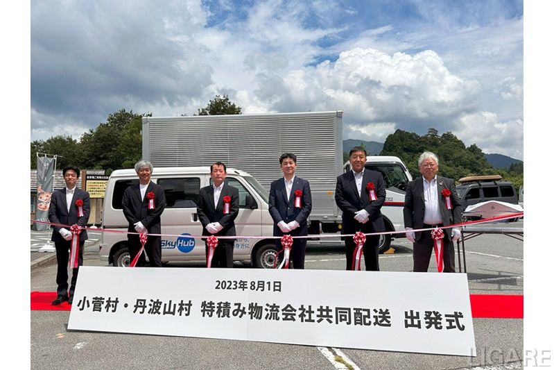 今回の取り組みは、山梨県北都留郡小菅村(以下、小菅村)、山梨県北都留郡丹波山村(以下、丹波山村)、セイノーHD、福山通運株式会社(以下、福山通運)、富岳通運株式会社(以下、富岳通運)、株式会社NEXT DELIVERY (以下、NEXT DELIVERY)の6者で実施する。さらに、8月1日に各代表の出席のもと出発式を執り行った。