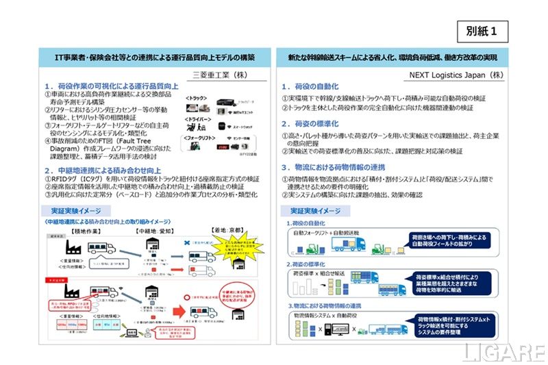 今回選定されたのは、「IT事業者・保険会社等との連携による運行品質向上モデルの構築」と「新たな幹線輸送スキームによる省人化、環境負荷低減、働き方改革の実現」だ。「IT事業者・保険会社等との連携による運行品質向上モデルの構築」は、三菱重工業株式会社を実施主体としている。一方、「新たな幹線輸送スキームによる省人化、環境負荷低減、働き方改革の実現」は、NEXT Logistics Japan株式会社が主体となって実施する。なお、プロジェクトの詳細は、以下で公開されている。