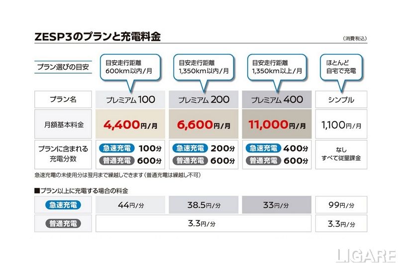 また、日産は、今回の料金改定に伴い、プラン名称をプレミアム10からプレミアム100などに変更する。充電サービスカードの利用開始にあたり、事務手数料として1枚あたり1650円がかかる。追加カード(1つのZESP3契約に対して充電サービスカードを1枚追加可能なオプション)は、月額基本料金2200円だ。充電料金は契約プランに準じ、プランに含まれる無料充電分数は2枚のカードで共有される。