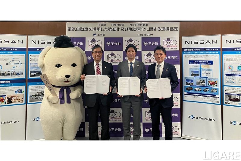 奈良県北葛城郡王寺町(以下、王寺町)と日産自動車株式会社(以下、日産)、奈良日産自動車株式会社の3者は11月22日、EVを災害時の非常用電源や脱炭素社会の実現に向け活用する、「電気自動車を活用した強靱化及び脱炭素化に関する連携協定」締結を発表した。