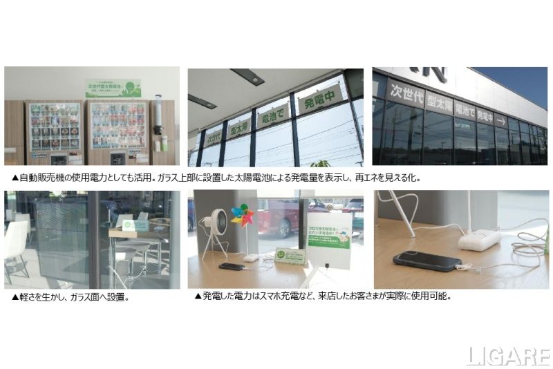 私たちが手掛けるカルコパイライト太陽電池は「薄く、軽く、曲げられる」ことに加え、金属と石の材料で形成されているため熱に強く、またつなげて自由な大きさで使用できるのが特徴です。今回の日産店舗では、1メートル以上の横長形状のものを店舗の窓に設置したほか、柱に巻きつける形でも設置しました。発電した電力は自動販売機やスマートフォン充電等に活用していますので、ぜひ来店されたお客さまには実際に電力を使っていただき、次世代型太陽電池について知っていただければと思います。