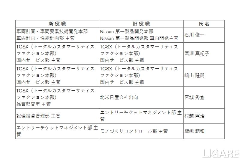 またTCSX関連では、冨澤 真紀子氏が、TCSX国内サービス部 主担からTCSX国内サービス部 主管へと異動した。同じく、嶋山 隆嗣氏も、TCSX国内サービス部 主担からTCSX国内サービス部 主管へと異動している。さらに、宮城 秀宜氏が、北米日産会社出向からTCSX品質監査室 主管への異動となった。