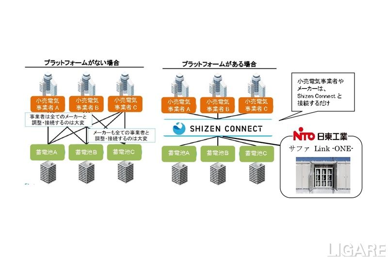 同事業では、Shizen Connect社がIoT技術とAIを利用し、独自開発するアグリゲート・エネルギー管理システム「Shizen Connect(シゼンコネクト)」(以下、Shizen Connect)を活用する。具体的には、日東工業の掛川工場に設置している日東工業製の環境配慮型「産業用太陽光自家消費蓄電池システム サファ Link -ONE-」の充放電を遠隔制御する。これにより、DERアグリ実証事業の枠内でDR制御※2を行い、需給調整市場(三次調整力②)の制御の技術性を明らかにするという。
