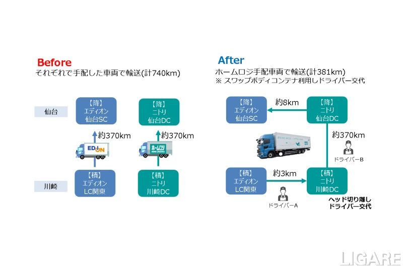 今回の取り組みでは、神奈川県川崎市にあるホームロジスティクスの物流センターとエディオンの物流センター2拠点で家具・家電を積み込み、仙台にある両社の物流センターで荷物の積み降ろしを行う。ホームロジスティクスが所有するスワップボディコンテナを活用し、シャーシとヘッドの分離および集荷ドライバーと荷降しドライバーを交代することで、積地・降ろし地の増加に対応可能だ。