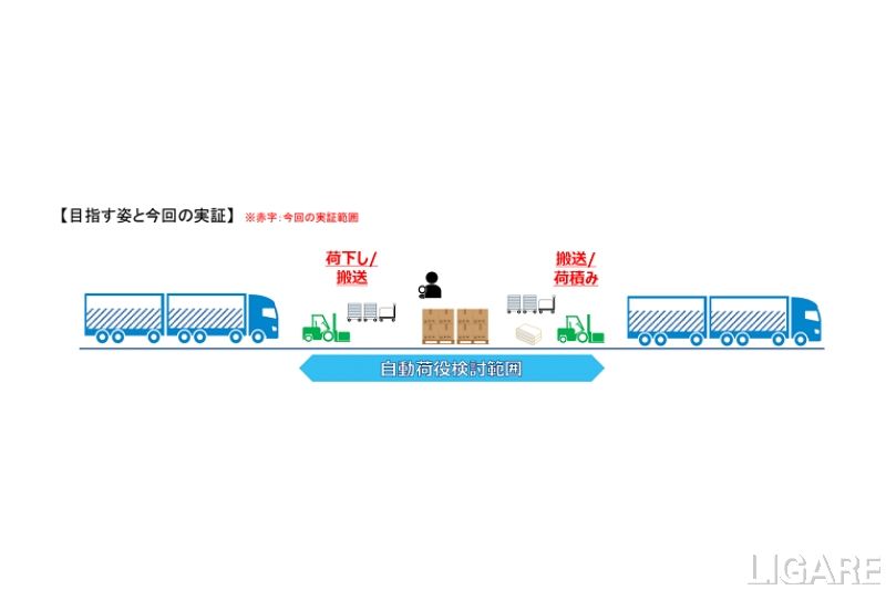 同実証では、この荷下ろし/荷積み作業の自動化(自動荷役)により、省人化の実現を目指す。2021年の実証では、豊田自動織機の協力の下、自動運転フォークリフトを活用し、一定条件下にて有人より精度の高い作業を実現している。今回の実証では、NLJの荷役オペレーションを想定し、自動運転フォークリフトにくわえ、新たにアイシンの協力の下、自律走行搬送ロボットを使用した実証を12月初旬から行う。