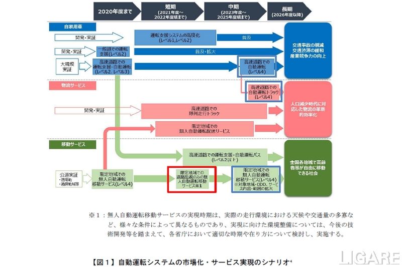 自動運転は、交通事故の削減や渋滞の緩和等を図る上で有効なものであり、近年、国内外において技術開発が急速に進展している。政府においては、「官民ITS構想・ロードマップ2020」において、2022年度頃に限定地域での遠隔監視のみの無人自動運転移動サービスを開始する。さらに、2025年をめどに全国各地域での無人自動運転移動サービスの実現を目指すこととされている。同時に高速道路でのSAEレベル4の自動運転トラック、自動運転の自家用車の市場化も目標としている。