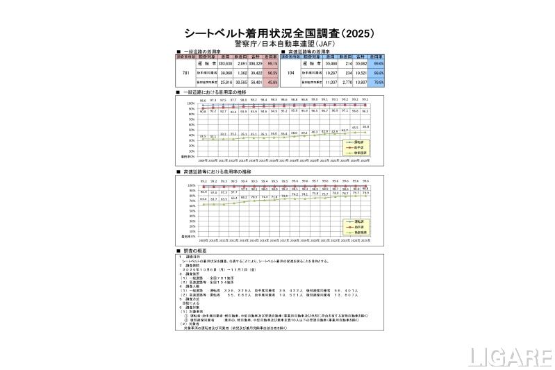警察庁、シートベルト着用状況の調査結果発表 運転席の着用率99%、後部座席の着用率45.8% 会員限定記事 2026/2/25(水) Post Share Pocket RSS 警察庁は2月16日、2025年10月6日~11月7日に実施したシートベルト着用状況の調査結果を発表した。 ※このコンテンツは会員限定です。無料会員登録すると続きをお読みいただけます。 会員登録済みの方はログインしてください。 ログイン ログイン メールアドレス パスワード ログイン情報を記憶 新規ユーザー登録 パスワードをお忘れですか ? LIGARE編集部h.s シート交通安全警察庁 Post Share Pocket RSS 関連記事: マイナ免許証、マイナンバーカード更新時も免許情報引継ぎ可能に 警察庁、2025年8月の交通事故統計発表 死亡事故は200件 警察庁、2025年9月の交通事故統計発表 死亡事故は227件 警察庁、2025年11月の交通事故統計発表 死亡事故は245件 チャリチャリ、大津市のシェアサイクル事業を発展継承。4月1日より市内全域でサービス開始 東武鉄道とタイムズモビリティ カーシェアで業務提携。東武伊勢崎線、日光線などの約30カ所、約70台を順次展開へ