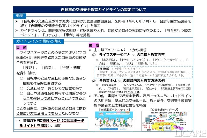 警察庁は12月11日、ライフステージに応じた自転車の交通安全教育の充実を図るため、ライフステージごとの教育目標や教育内容、各教育主体の教育内容や教育方法の例等をとりまとめた「自転車の交通安全教育ガイドライン」を公表した。