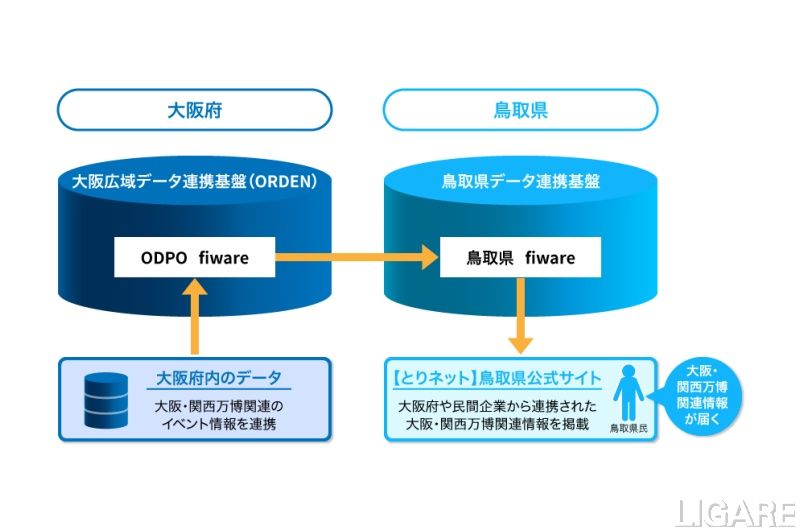 NTTビジネスソリューションズは、大阪府に対し、大阪広域データ連携基盤(ORDEN※2)の一部機能であるODPO(Open Data Platform in Osaka)fiware※3等のサービスを提供している。今回の取り組みの目的は、鳥取県民に対して大阪・関西万博関連情報を提供することによる、都道府県間での観光客周遊だ。