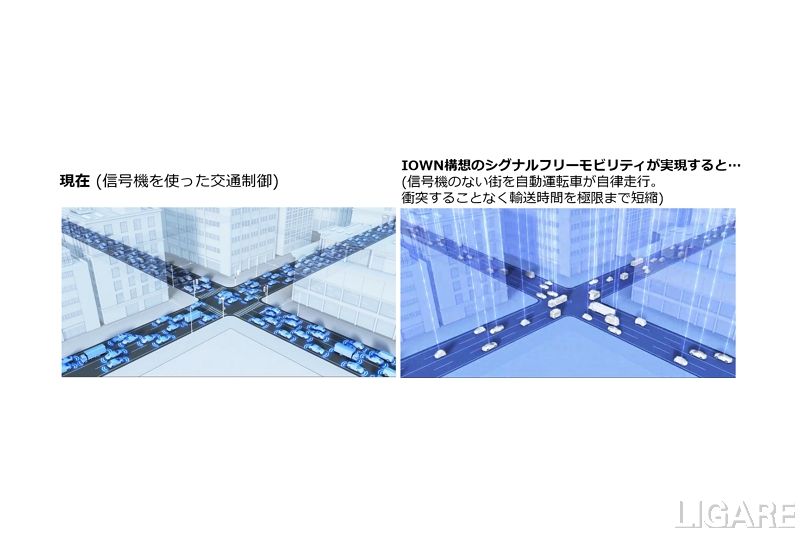 将来、ICTの高度化により、ヒト・クルマ・インフラが高度に協調し、安全かつ効率的な移動を提供する高度協調型モビリティ社会の実現が期待されている。IOWN構想※のシグナルフリーモビリティが実現すると、信号機のない街を自動運転車群が相互に通信をしながら自律走行し、衝突することなく輸送時間を短縮することが可能だ。