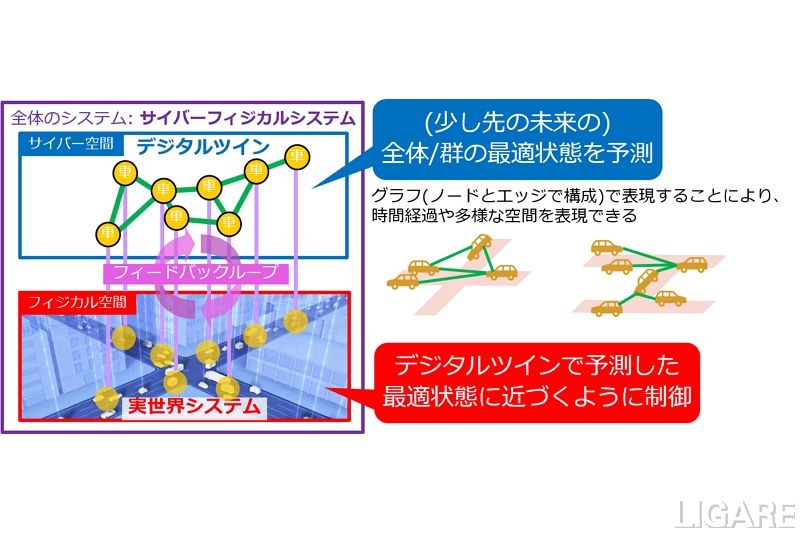 同研究では、各車とそのつながりで構成されるグラフを用いて、デジタルツインの状態予測系をモデル化した。時々刻々と変化する複雑な交通制御を単純な部品(各車の状態予測/制御と近接車間の通信)の組み合わせで表現することを目指している。