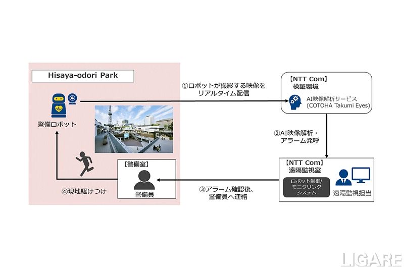 警備ロボットによる園内管理業務の高度化では、夜間帯も含めた全日、Hisaya-odori ParkのZONE3、およびZONE4にて警備ロボットを屋外で自動走行させ、巡回警備を行う。警備ロボットにはカメラが搭載されており、このカメラが撮影した映像は、5Gを含むモバイルネットワークを活用してNTT ComのAI映像解析サービス「COTOHA Takumi Eyes」に連携される。「COTOHA Takumi Eyes」は、連携された映像を解析することで迷惑行為者を遠隔で検知し、現場の警備員と連携することで園内警備の強化および効率化を図る。