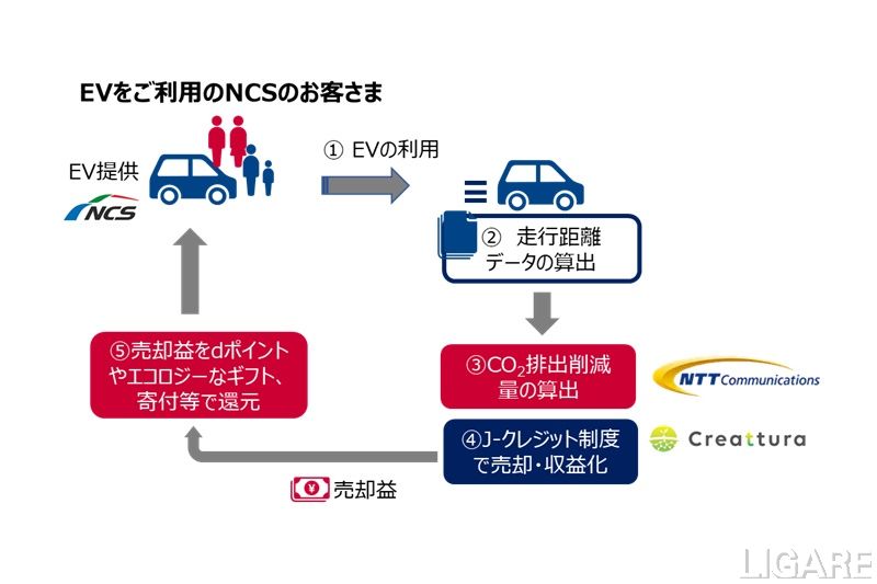 具体的な取り組み内容としては、NCSがリースで提供するEVを利用中のユーザーに対し、EVで走行した距離を測定の上、その走行距離に応じて、発生した温室効果ガス削減量をJ-クレジット制度を用いてクレジット化する。それを原資として、ユーザーにdポイントやエコロジーなギフト、社会貢献の一環としての寄付などで還元する予定だ。また、取得できる移動データを活用した、新たなビジネスの可能性も検証する。