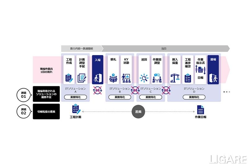 今回の協業では、工程表~作業日報までの各施工管理に係わるデータを情報粒度の差異を調整しながら、実用的なデータ連携を実現するロジックを開発することで「施工管理業務のDX」を実現。さらに、ゼネコンおよび協力会社を含めた現場関係者が広く利用することで、プロセスを革新し、建築現場の生産性向上や働き方改革を推進する。