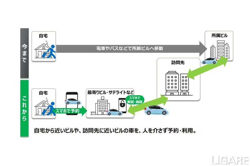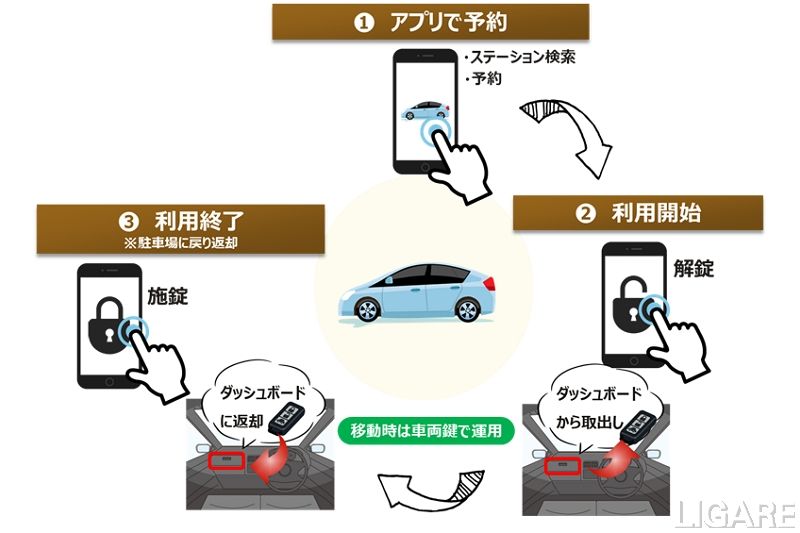 また、「ノッテッテ エンタープライズ」は、スマホアプリで車両のドアを開錠・施錠できる「キーレスシェアリングシステム」を採用している。これにより、利用者は、車の鍵の受け取りのためにオフィスビル等に立ち寄る必要がなくなる。