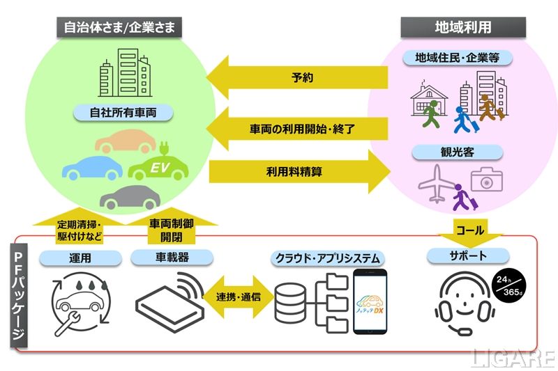 くわえて、「ノッテッテ PFパッケージ」には、車両管理システム(車両の空き状況管理、予約、料金決済等)、車載機器、スマホアプリが含まれている。問い合わせ対応のコールセンター(24時間365日対応)、定期清掃派遣、トラブル時の駆付け派遣も行う予定だ。さらに、オプションサービスとして、駐車場開設支援(駐車場機器の手配、看板設置、EV充電器設置支援)およびメンテナンス、各種申請支援・提供エリア調査・レポート提出等も実施するという。