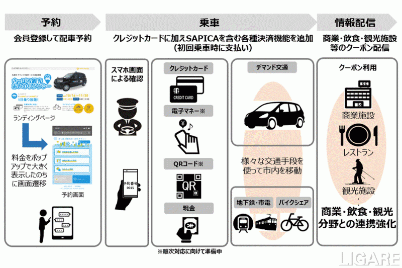 NTTなど5社 札幌市で相乗りタクシーとサイクルシェアを合わせたサービスの開始 観光の移動問題の解決へ