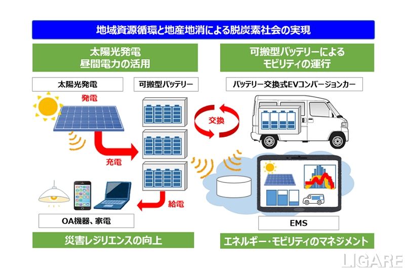 蓄電池の普及に向けては、蓄電池としての価値を最大化し、より利便性の高い利用環境を実現することにより、自治体や企業法人にとっての導入メリットを向上していくことが必要だ。このような背景から同事業においては、太陽光発電、可搬型バッテリー、CEVの情報を連携・分析することで、発電量・需要量の予兆を把握する。そして、再生可能エネルギーの活用と地域におけるエネルギー循環による脱炭素社会の実現につなげることを目指す。