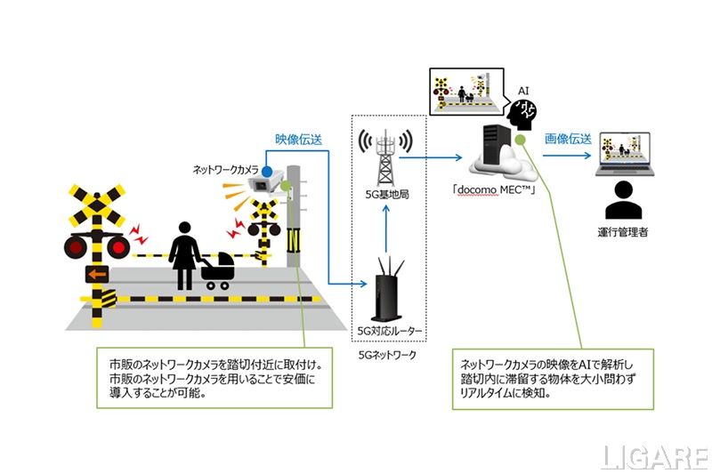 また、同システムは、踏切付近に取り付けた市販のネットワークカメラの映像を、5Gネットワークで「docomo MEC」に伝送しVAE※1や背景差分技術※2を活用してAIにより解析。これにより、線路内に滞留する物体を大小問わず高精度かつリアルタイムに検知する。物体を検知した場合、施設管理者へアラート通知するという。