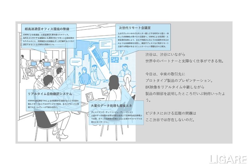 また、3社は、次世代社会のイメージとして、「働く場所に縛られない次世代オフィステナント」、「最新技術の粋を凝らした次世代商業フロア」、「次世代サービスが身近になった暮らし」を提示している。「働く場所に縛られない次世代オフィステナント」では、複数オフィスの拠点間をIOWNサービスでつなぎ、高画質かつ大画面で互いの会議室を投影する。これにより、まるで対面しているかのようなオンラインミーティングが可能となる。多言語のミーティングにおいても、お互いの発言がリアルタイムで自動翻訳されることなどが期待できる。