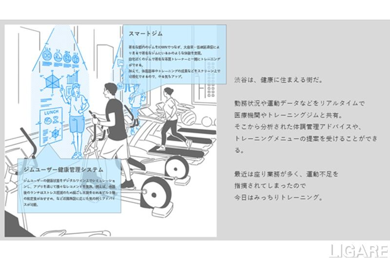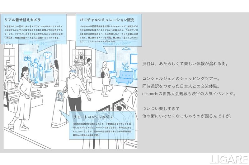 「最新技術の粋を凝らした次世代商業フロア」では、IOWNサービスをサービスセンター等の拠点と多拠点との大容量リアルタイム通信の手段として活用する。これにより、遠隔地から温かみのある接客を可能にした自動翻訳付きリモートコンシェルジュやリアル着せ替えカメラなどが可能となる。さらに、「次世代サービスが身近になった暮らし」では、スマートジムなど、渋谷での生活を便利で充実したものにする次世代サービスを身近な施設で気軽に体験することができる。