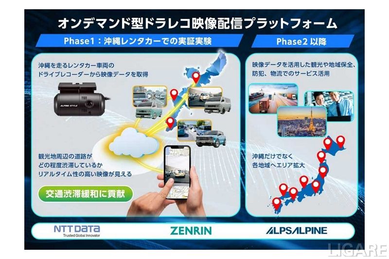 今回の協業は、NTTデータ、株式会社ゼンリン、アルプスアルパイン株式会社の3社で行う。具体的には、レンタカー車両にドライブレコーダーを装着し、Webサイト上で各車両から得られた画像、映像についてレンタカーを利用する観光客へ提供するプラットフォームを構築。同プラットフォームにおける有用性を検証するため、観光客数や地理的条件から実証に適した沖縄県をフィールドに設定し、実証を行う。