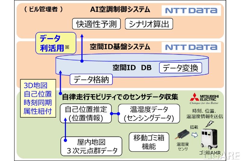 具体的な実証内容としては、温湿度センサを搭載した三菱電機のゴミ箱AMRと、収集した温湿度の情報と時刻を空間IDにひもづけて空間ID基盤システムを連携した。そして、同AMRをNTTデータ品川ビルの2階エントランスフロアを自律移動させている。