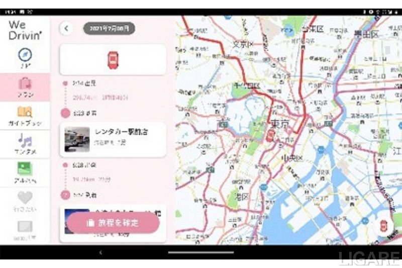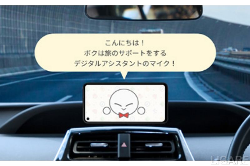 NTTデータは、オリックス自動車株式会社(以下、オリックス自動車)、株式会社JTBコミュニケーションデザイン(以下、JTBコミュニケーションデザイン)とともに、同サービスの実証実験を行った。レンタカーに同サービスのプロトタイプを設置し、助手席や後部座席に専用のタブレット端末を設置した。タブレットでは画面情報を共有し、目的地の変更や目的地までのルートを自由に入れ替えることも可能だ。マスコットキャラクターが旅行案内人となり、各機能の説明や案内を行うことで、利用者に新しい発見、楽しさを提供する。