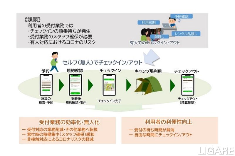 このとき実証では、スマートチェックインのデモ環境を構築し、全国のキャンプ場において平均5時間/日と多大な労力がかかっているチェックイン業務削減の有効性等を検証している。さらに、キャンプ場周辺地域の魅力的な観光施設や温浴施設とキャンプ場のセット予約を開始することで、キャンプ場周辺地域への誘客や消費を促す機会を創出した。