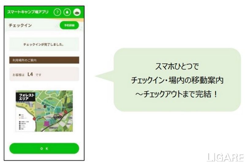 スマートチェックインでは、利用者の利便性が向上するとともに、キャンプ場スタッフの受付対応業務の省力化により、その他業務への効率的な業務配分に寄与し、キャンプ場のサービス向上を図る。