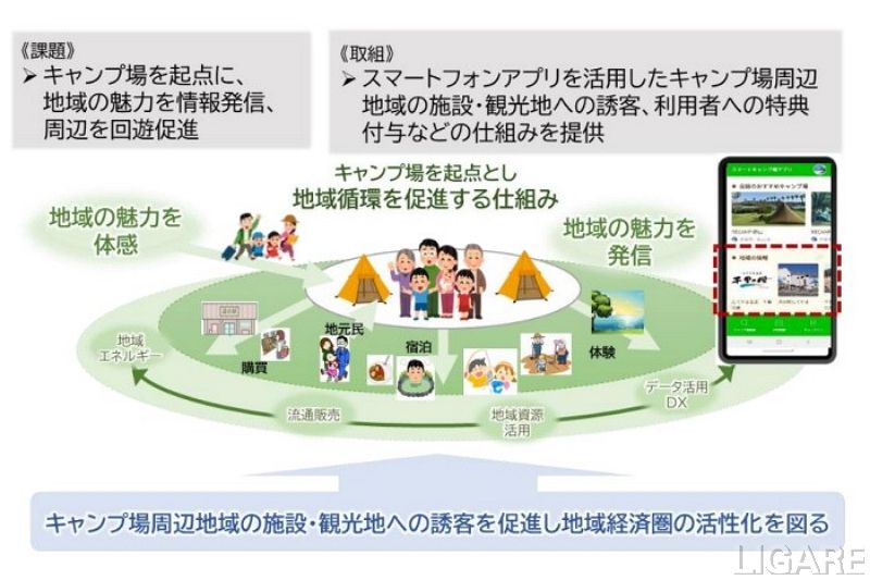 一方、周辺地域への誘客による地域活性化では、「なっぷ」におけるキャンプ場の予約時に、施設利用券(一部特典付き)とのセット予約、および専用アプリ上での施設利用券の提示や周辺施設の情報配信を実施する。メイン利用者であるファミリー層に人気のいちご農園や、キャンプ後に人気の温浴施設と連携する予定だ。