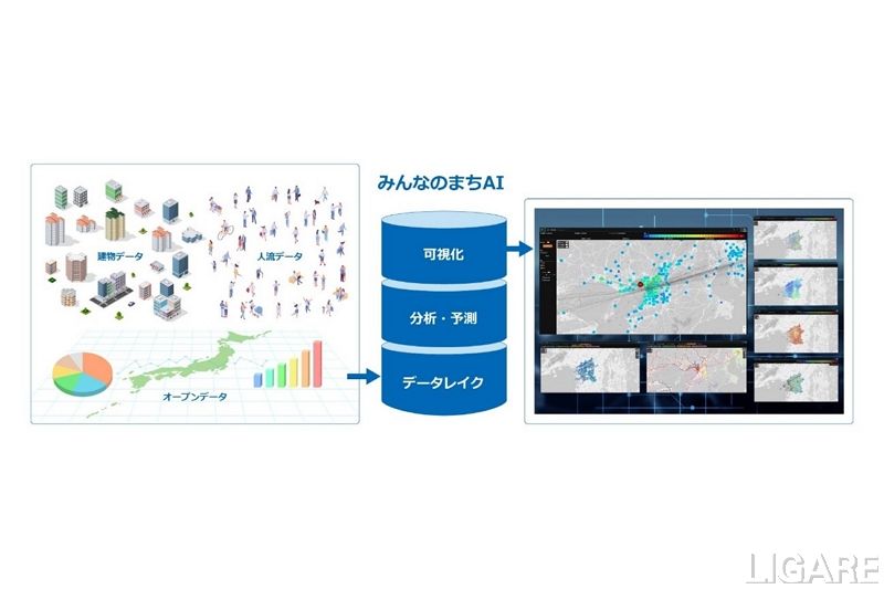 「みんなのまちAI」では、人流や建物のデータやその他のオープンデータを蓄積し、まちの詳細な情報を分析・予測し、デジタル上に再現することができる。これにより、今までわからなかった細かい粒度(メッシュ)での人の行動目的や行動予測が可視化され、より精緻な売上予測や混雑予測、交通シミュレーション等が可能になる。