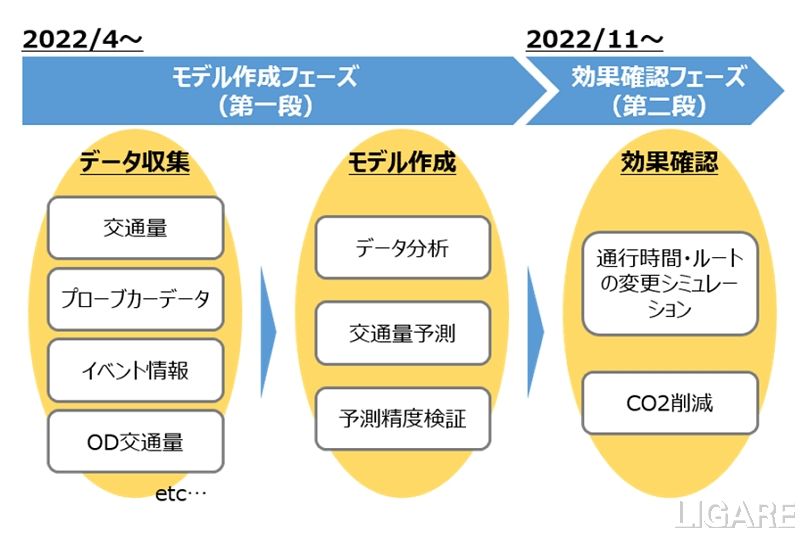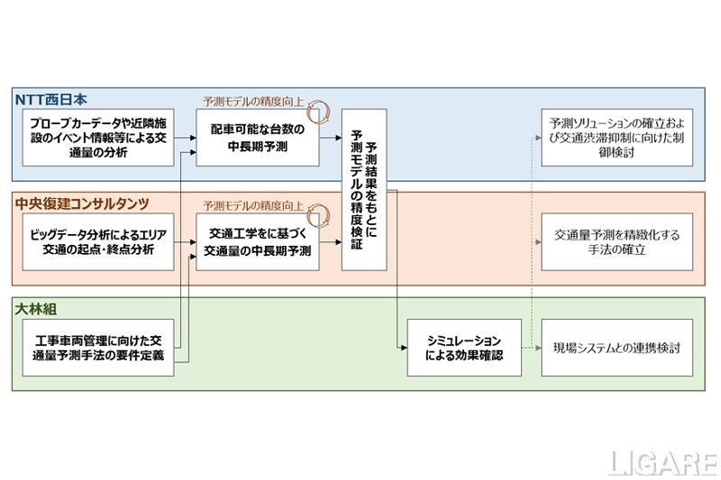 第一段では、交通量の分析・予測が可能なNTT西日本・中央復建コンサルタンツが、異なるアプローチで分析・予測した周辺の交通情報を基に、大林組が工事車両管理に必要な指標や要求精度を定義し、交通量予測モデルを作成した。今回の実証では、第二弾として作成した交通量予測モデルを活用する。そして、夢洲周辺の工事現場を想定した工事車両発生台数に基づいた交通量変化のシミュレーションを通して、効果の確認を行う。