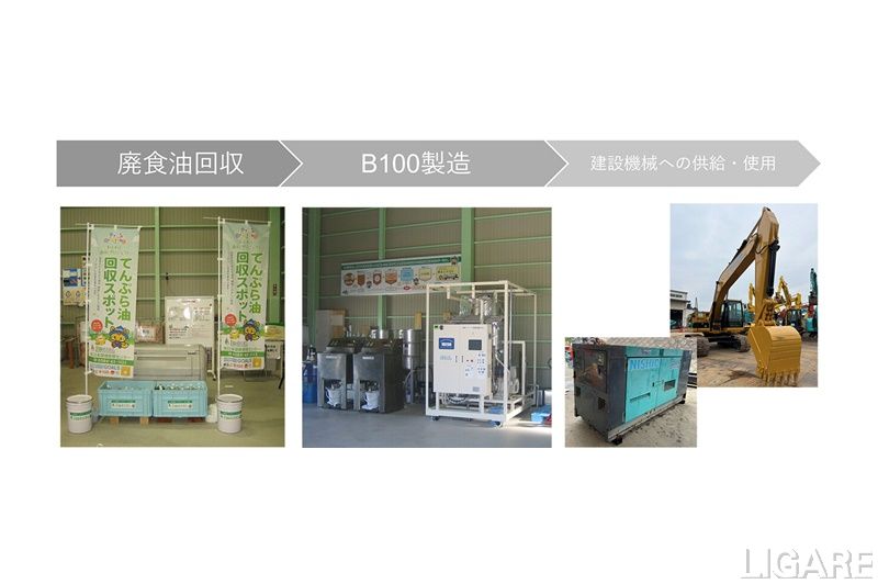 同実証では、株式会社松林(以下、松林)、西尾レントオール株式会社(以下、西尾レントオール)と協働し、大林組大阪本店および西日本ロボティクスセンターの食堂で使用した食用油を回収。一般家庭などから出た廃食油とともに製造委託先でB100燃料を精製する。さらに、精製した燃料は、松林が配送を担当し、大林組が施工する大阪・関西万博の工事で、西尾レントオールから借り受ける建設機械(油圧ショベル、発電機)に軽油に代わる燃料として使用する。