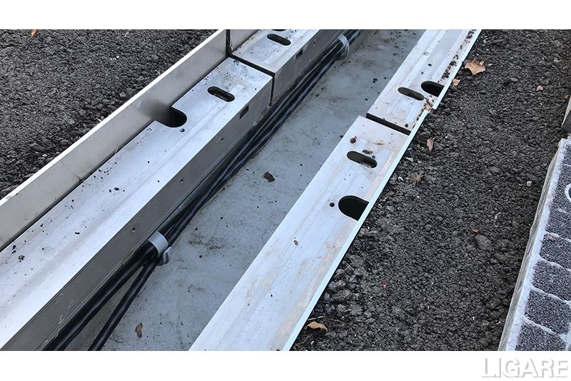 「道路に電力・情報ネットワーク網を構築する技術」は、大林組と古河電気工業株式会社が共同で研究する。この研究では、両社が共同開発した「雨水側溝兼用樹脂製トラフ」を使用する。雨水側溝とケーブル収納トラフを兼ねることにより、電源・制御・通信ケーブルネットワークの構築を低コストで実行可能になる。これにより、自動運転車の普及に伴う車対車、歩行者対車間の安全確保に貢献する。今後、雨水排水性や耐久性、施工性などの実証をしていく予定だ。