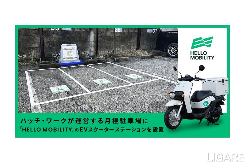 OpenStreet株式会社(以下、OpenStreet)は11月8日、株式会社ハッチ・ワーク(以下、ハッチ・ワーク)提供の月極駐車場オンライン管理支援サービス「アットパーキングクラウド」を導入する駐車場に「HELLO MOBILITY」のEVスクーターのステーションを設置したと発表。今後はさらに設置場所を拡大していくという。